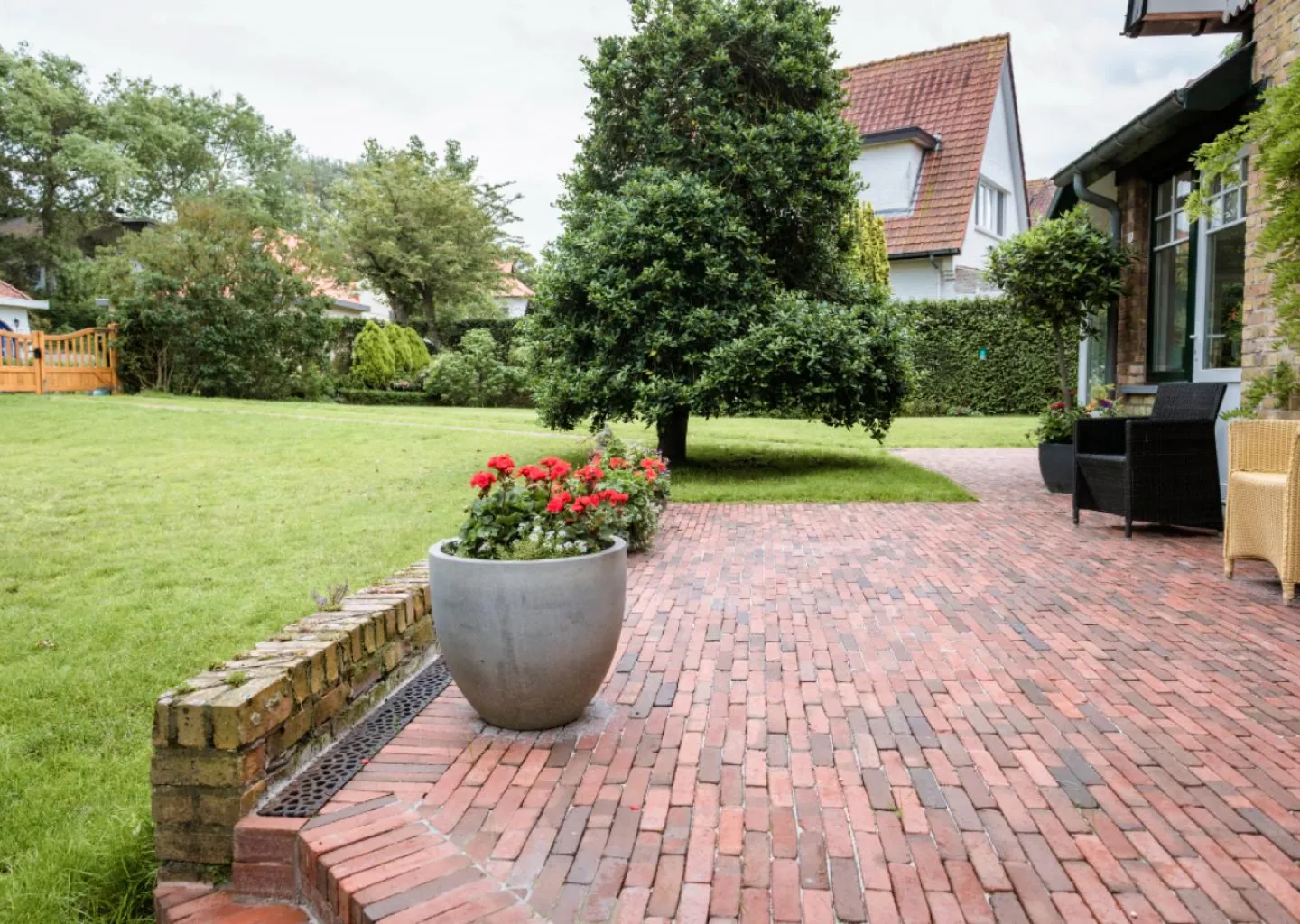 Om de oprit licht te houden werkten we met een karrenspoor waarbij gekozen werd voor een kleiklinker van Terca uit de Authentica reeks. Ook de terrassen werden aangelegd in deze gebakken klinkers.