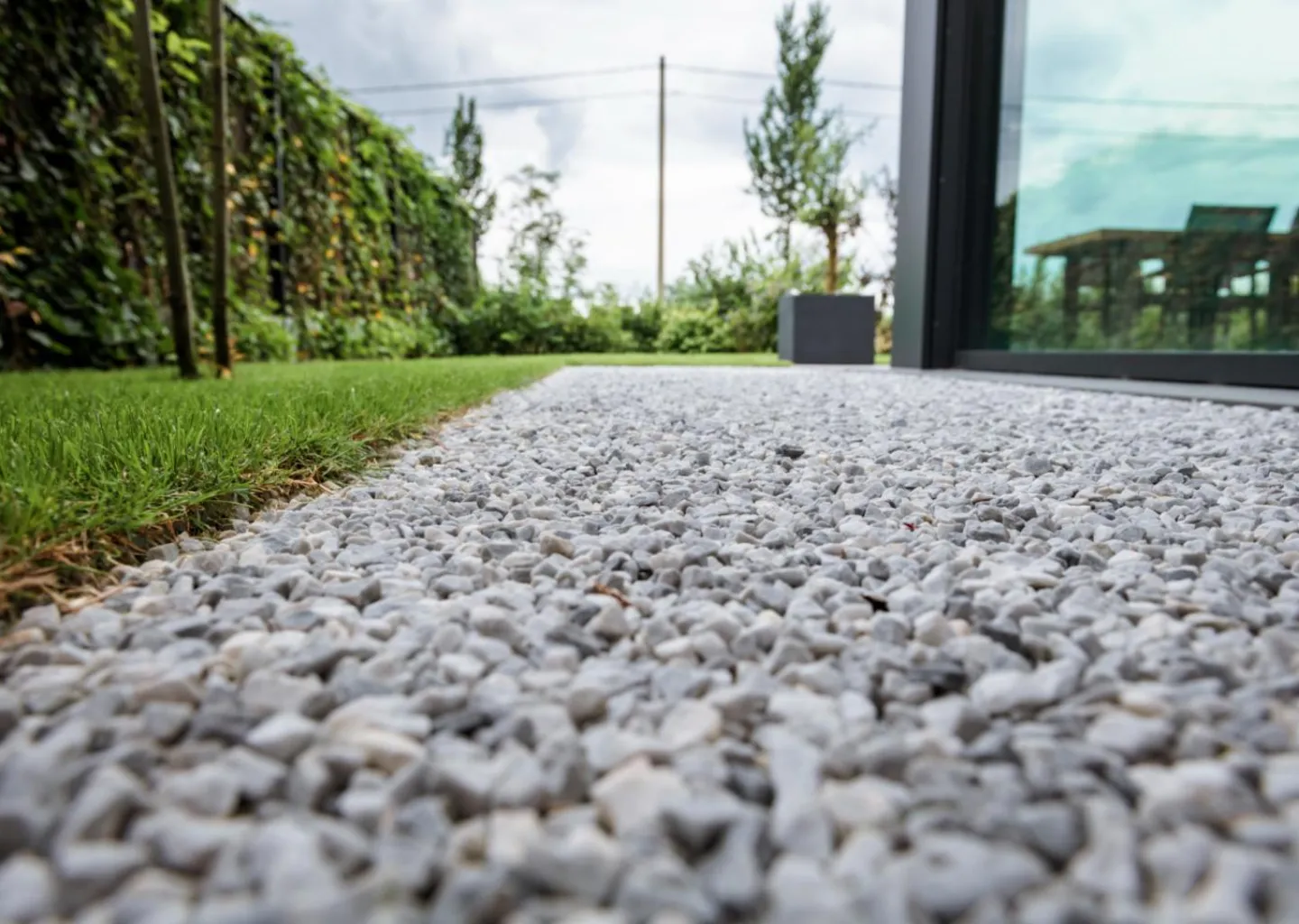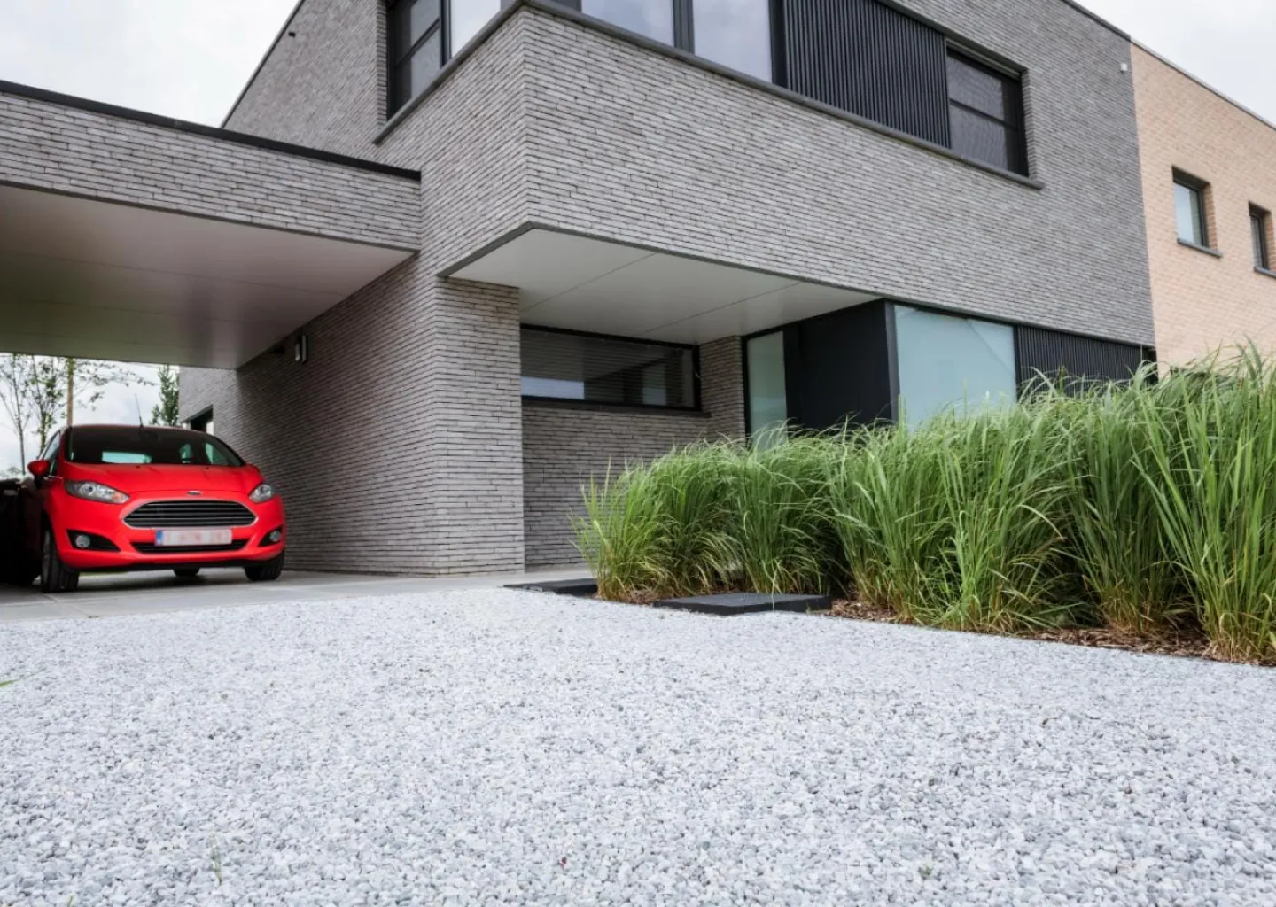 Voor deze nieuw gebouwde tussenwoning maakten we voor de oprit gebruik van grootformaat betontegels Eurodal en siergrind Nevada.