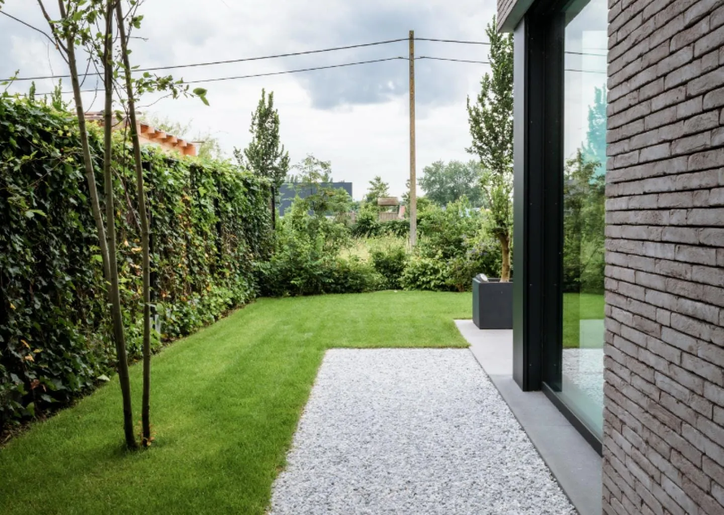 Er werd ruimte voorzien voor een stukje gazon en op de nieuwe afsluiting tussen de twee percelen mag een klimophaag zijn gang gaan.