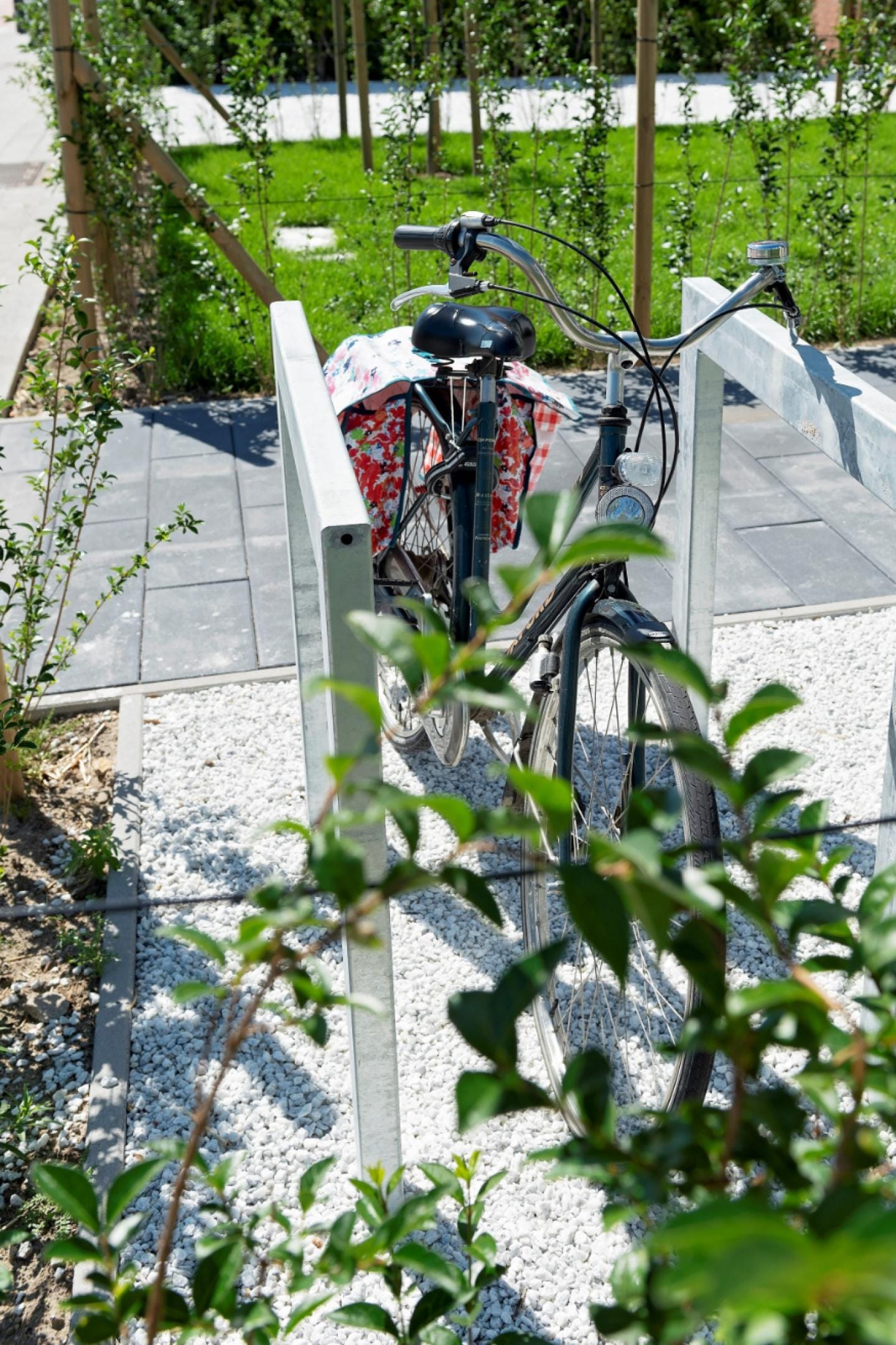 De hagen in Ligustrum ovalifolium die de privé-tuintjes afzetten zijn toegankelijk gemaakt met poortjes in thermowood.