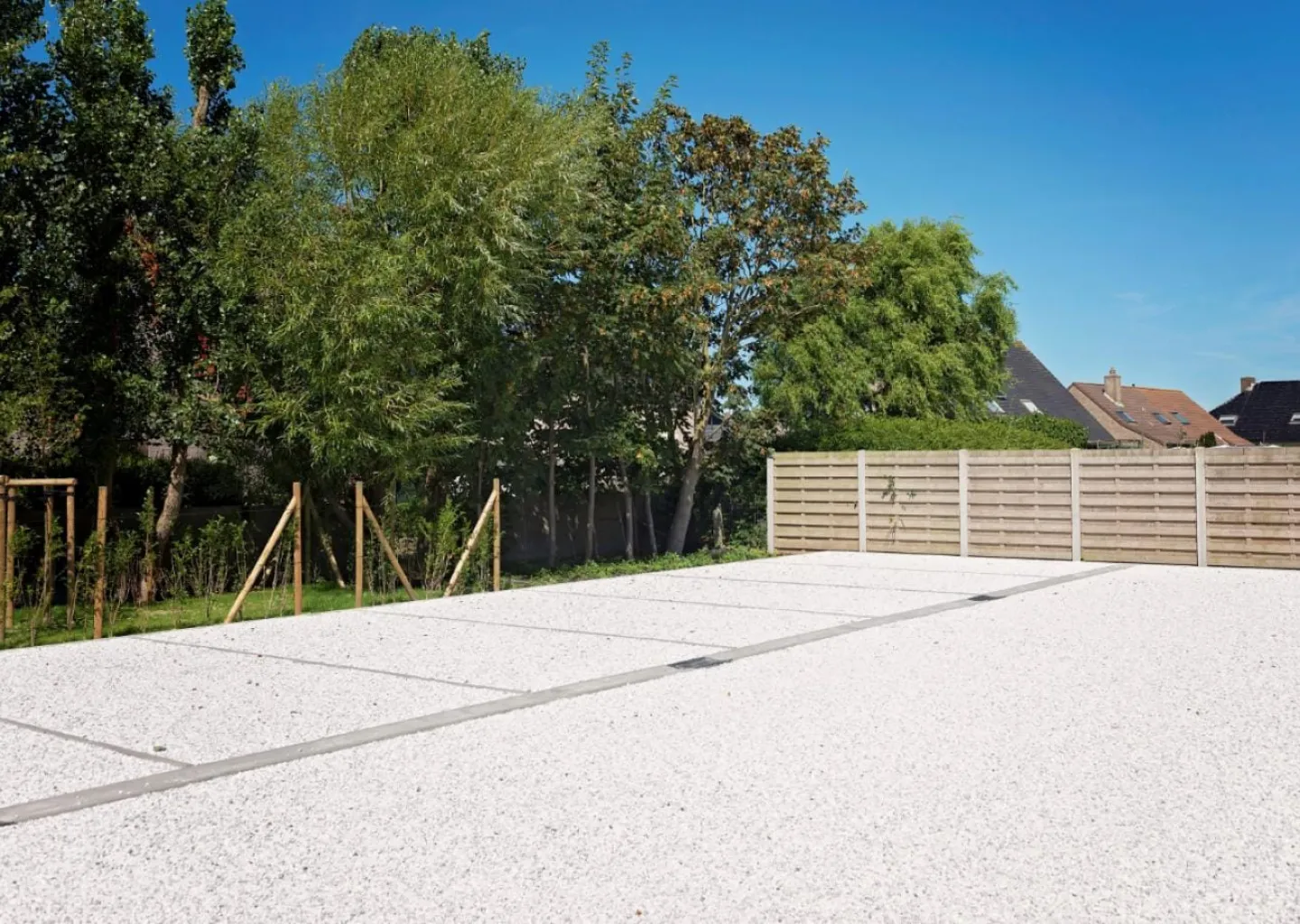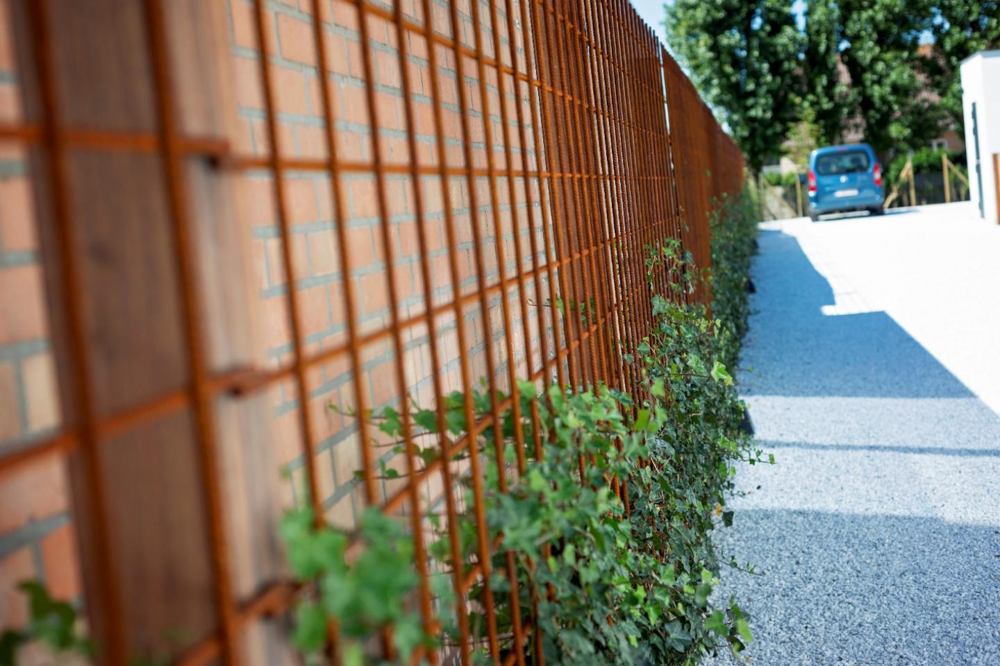 De oprit werd uitgevoerd in waterdoorlatend siergrind. Als afsluiting werkten we met betonnetten bevestigd tegen hardhouten palen waar we klimop laten op groeien.