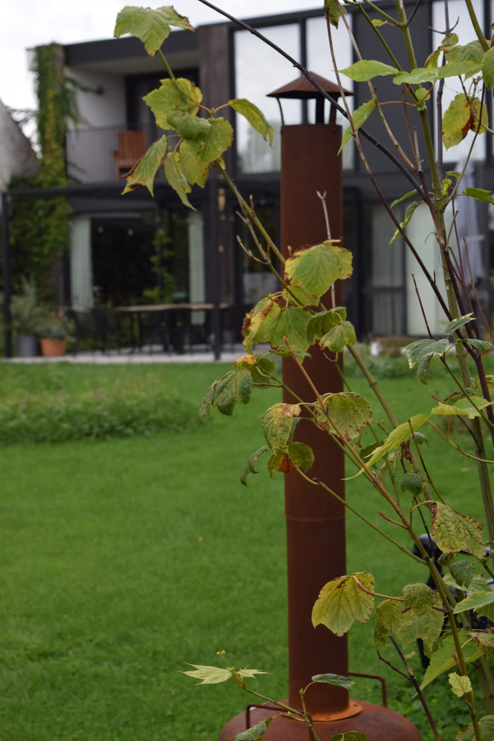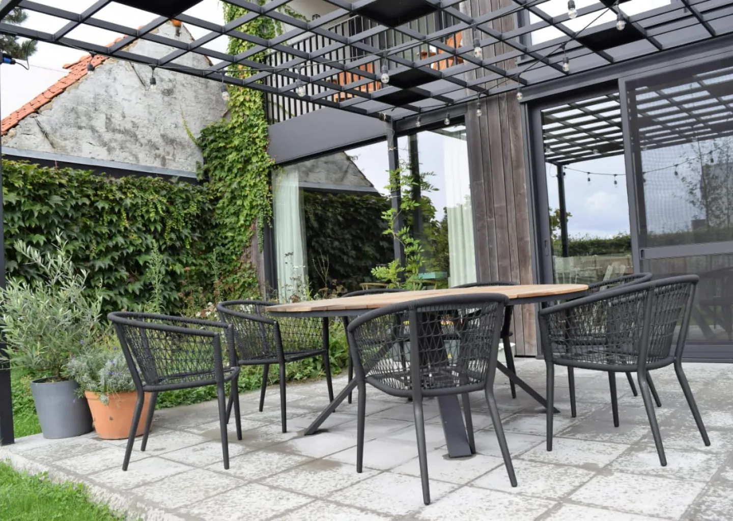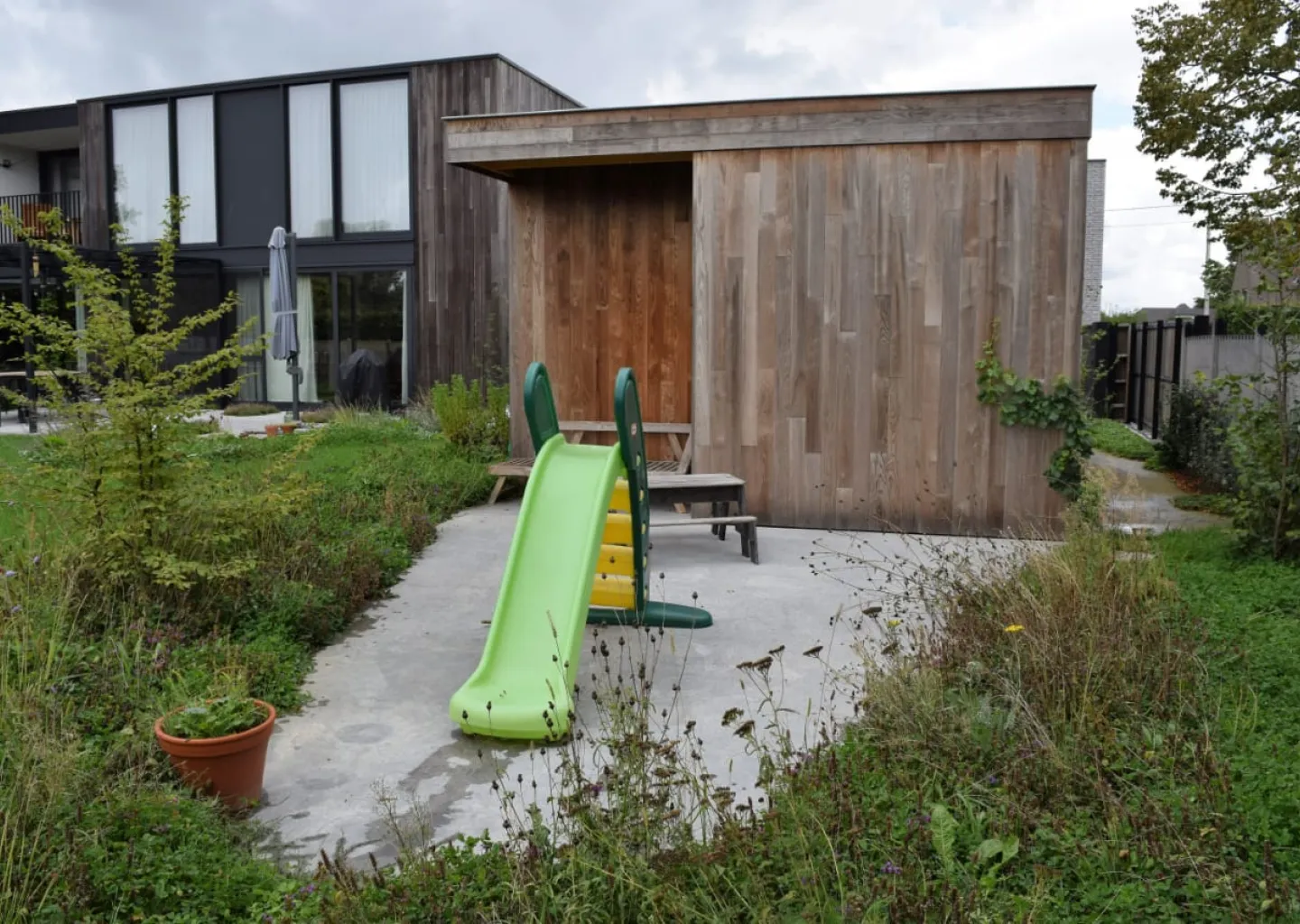 Hetzelfde hardhout werd gebruikt voor de carport op maat waartegen vele klimmers hun gang mogen gaan.