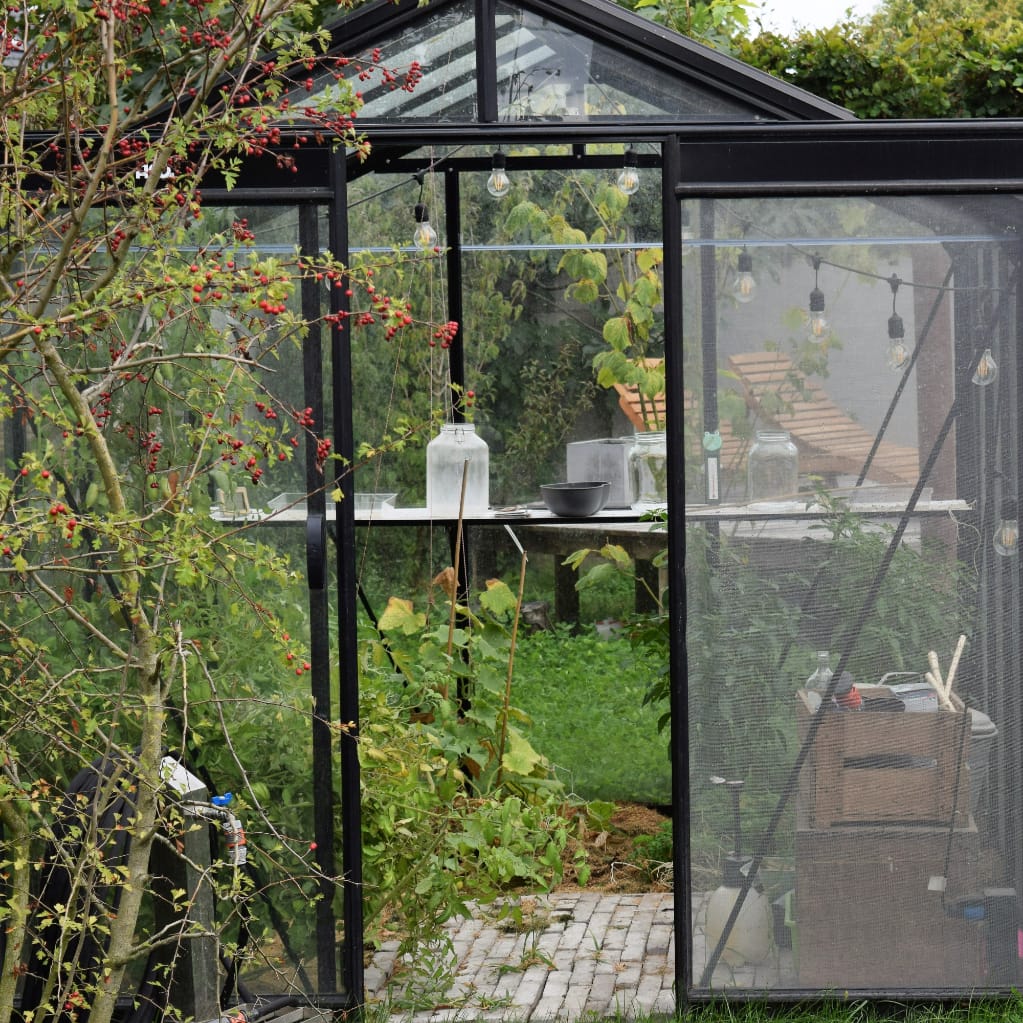In het kleine greenhouse wordt naast de eerste stappen in het moestuinieren ook al eens een apéro met zijn tweetjes gedronken.