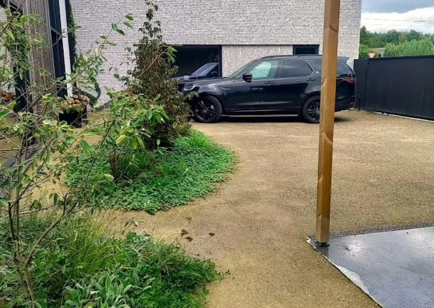 De oprit werd waterdoorlatend uitgevoerd met een Koers halfverharding.