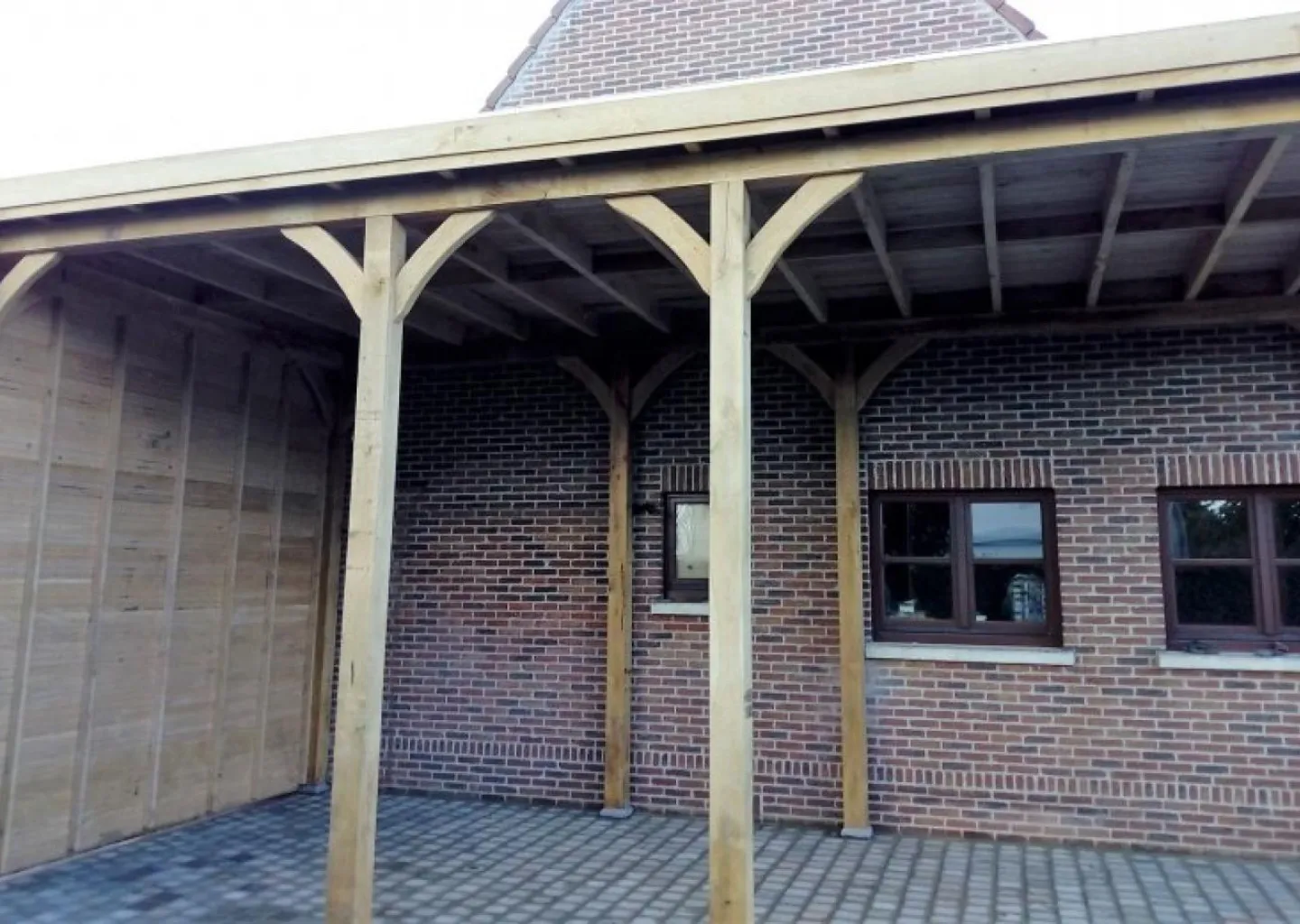 Plaatsen van verhoogte carport in eik en bestrating in platinnen.
