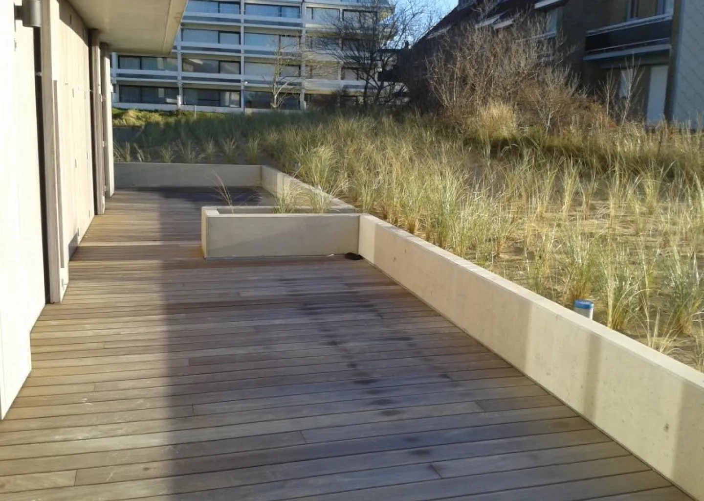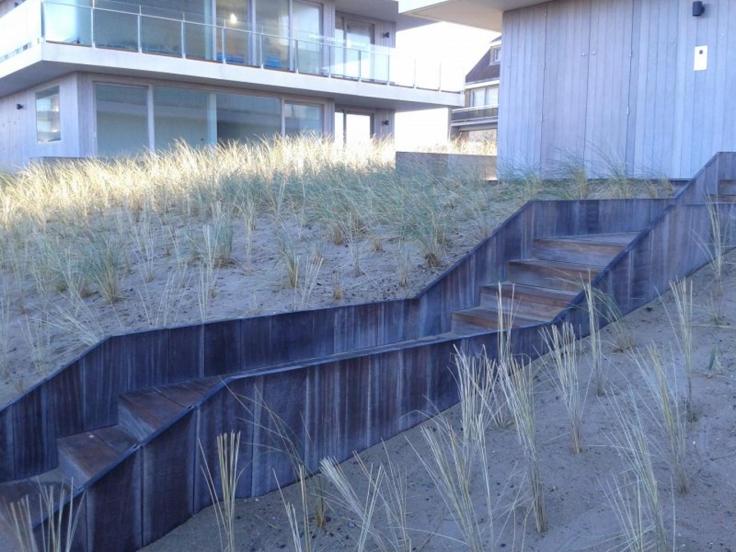 Dit markante gebouw had niet veel meer nodig dan houten terrassen, zand en helmgras. De inkompaden/trappenconstructies werden uitgevoerd in stevig hardhout.