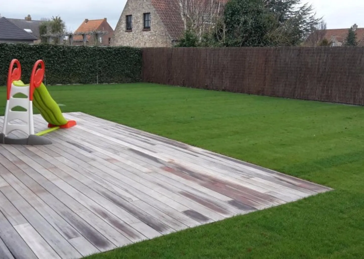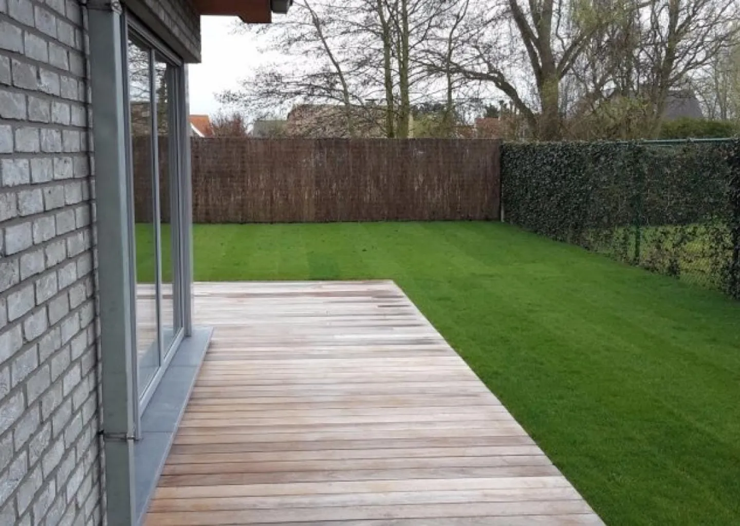 De opdrachtgevers contacteerden ons voor de realisatie van hun tuin bij hun nieuwbouwvilla. Hun allereerste tuin moest vooral sober zijn en véél speelruimte toelaten voor hun jonge spruiten. De achtertuin bestaat dus naast het hardhouten terras uit véél gras om te ravotten. Deze zone is netjes afgesloten met bedrading en een hardhouten poort. Paden werden uitgevoerd in betonnen megategels. Het voortuinperk bestaat uit een combinatie van siergrassen met hier en daar een vaste plant tussen.